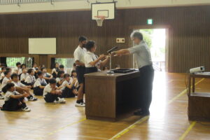 さて夏休み明け集会では、まず校長先生より夏休み中の様々な行事と子どもたちのがんばりについてと、今後のチャレンジに期待する旨のお話がありました。その後、良い歯のコンクールの表彰を行いました。受賞された2名の6年生の方々、おめでとうございます。