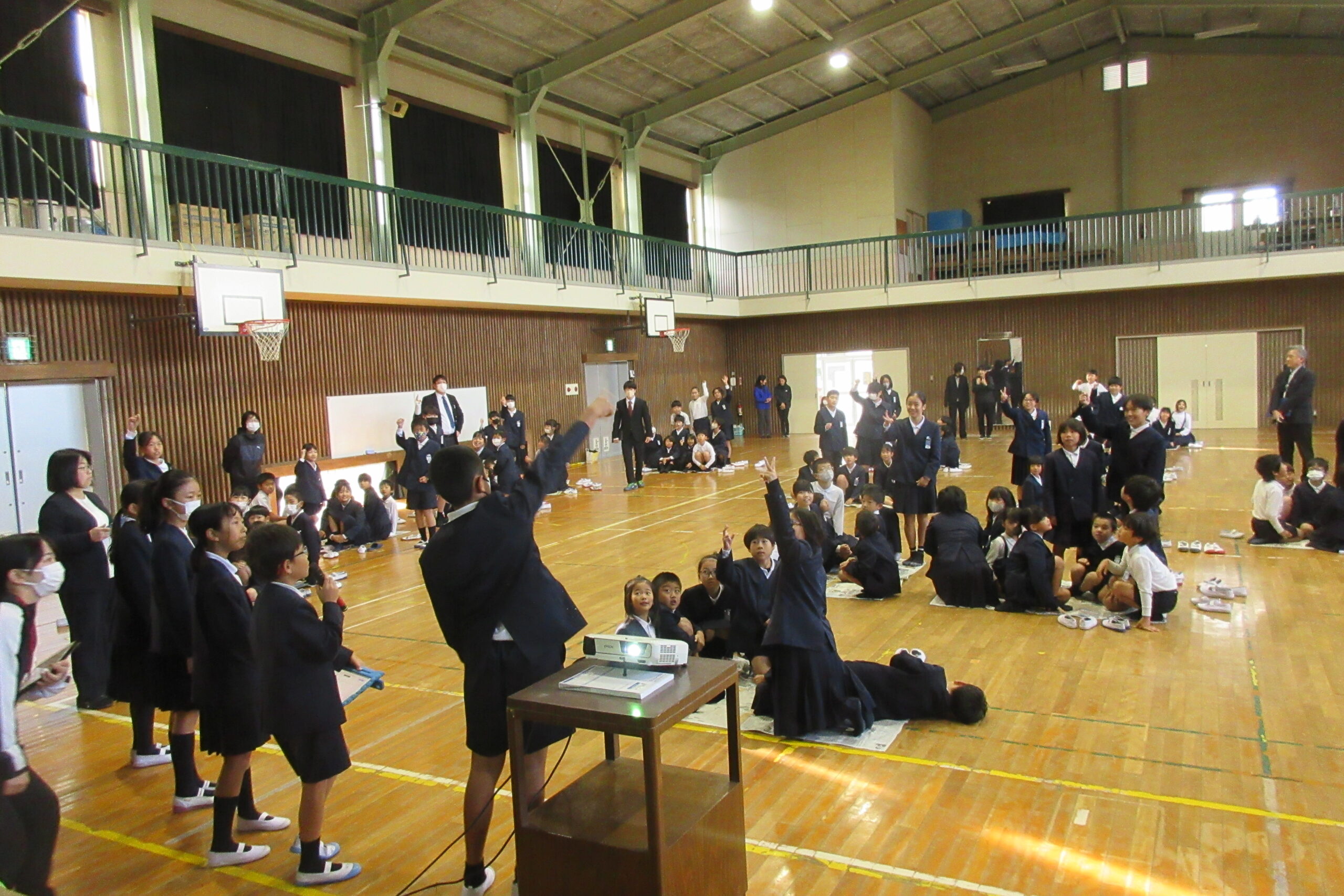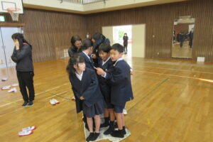 その後、運営委員会主催の全校遊び、今回は新聞島です。縦割り班の子どもたちが島に見立てた新聞紙に乗ってゲームスタートです。代表児童がじゃんけんをし、負けたら新聞を半分にしていきます。どんどん島が小さくなっていき、新聞紙から班員が出たら失格です。