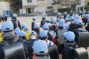 久々に登校したこともあって、この日は一斉下校。グラウンドにみんなが集まって出す「サイン」の声も大きく、今年も事故なく、安全な登下校をみんなで願いました。