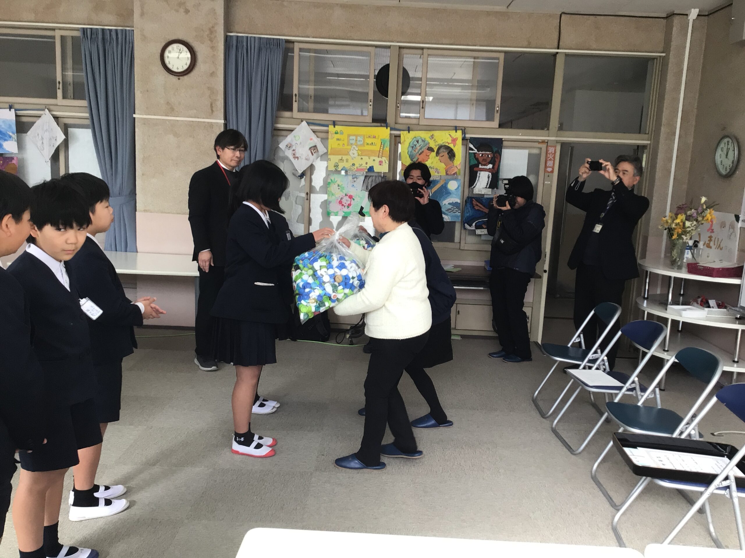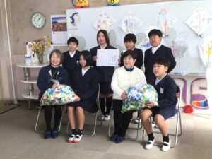 2月4日(水)13時より、本校ふれあいルームでペットボトルキャップに贈呈式を行いました。今年は86kgものペットボトルを寄付させていただきました。ペットボトルキャップ2kgで1人分のワクチンと交換できるとあって、今回はワクチン43人分ということになります。