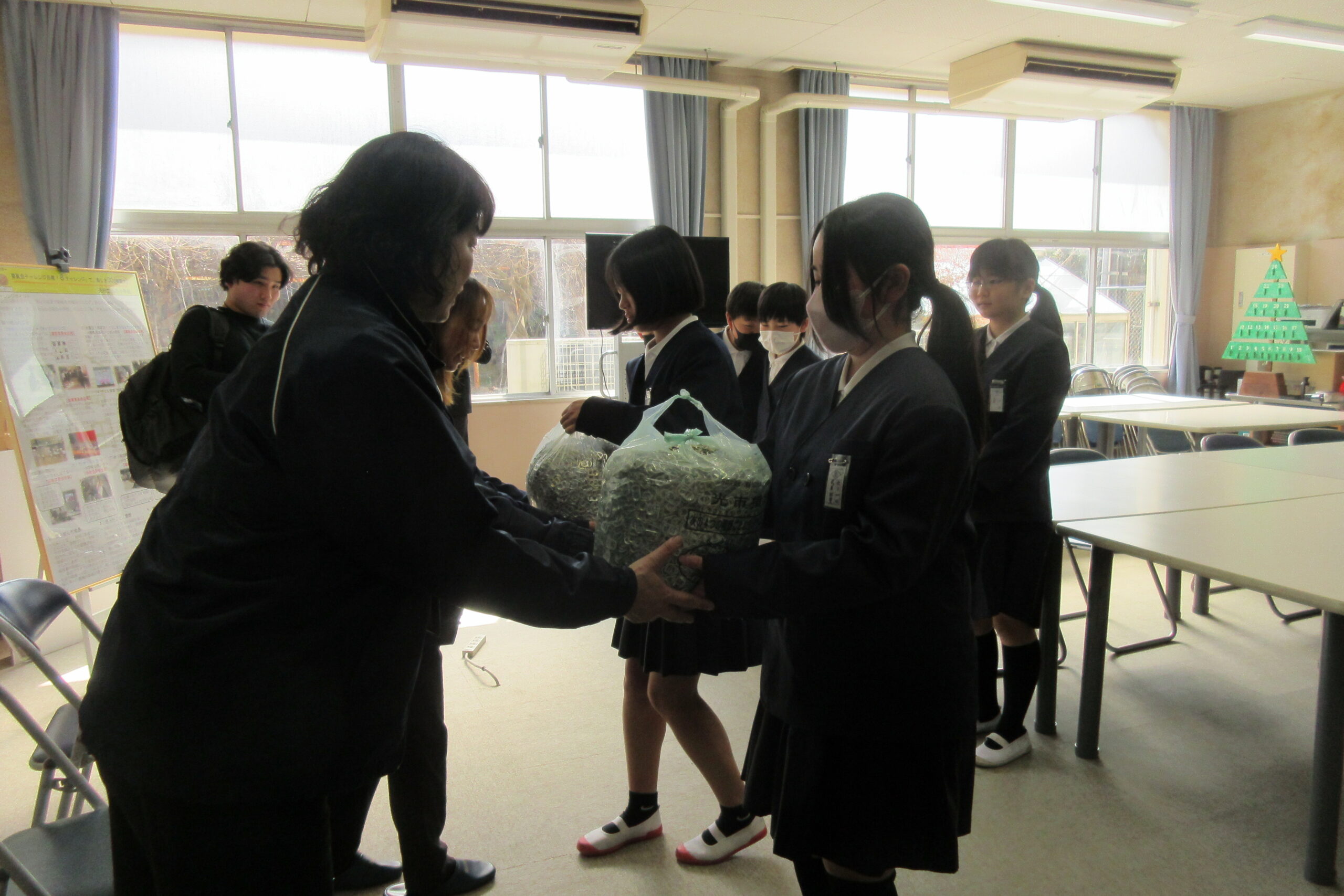ニュース2月6日(金)13時より、本校ふれあいルームでプルタブ贈呈式を行いました。約5kgものプルタブが入ったビニール袋が10袋以上。50kg以上のプルタブを社会福祉協議会に寄付させていただきました。プルタブは800kgで車いす1台と交換ということで、1台分まではいきませんが協力させていただきました。これからも島田小学校は福祉教育に力を入れ、少しでも光市の福祉のお役に立てればと思います。